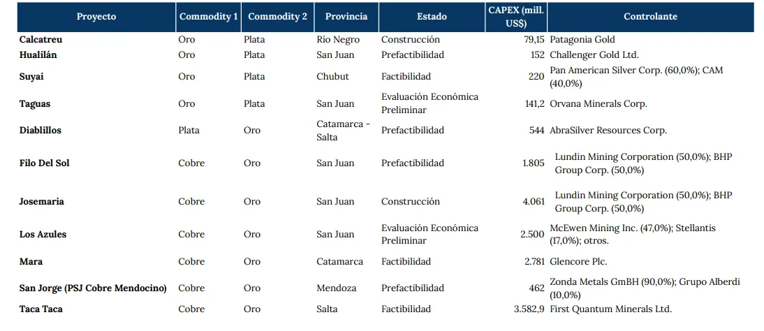 - Proyectos Avanzados: En cuanto a los proyectos que se encuentran en etapas avanzadas, impulsados principalmente por el cobre, se localizan mayoritariamente en la región de Cuyo, sobre todo en la provincia de San Juan. No obstante, también hay avances prometedores en la Patagonia y el Noroeste argentino.